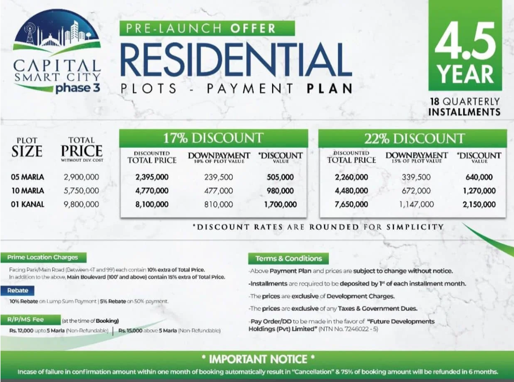 To ease the buying process, Capital Smart City has introduced a pre-launch payment plan for Phase 3, featuring a 4.5-year installment schedule. The plan starts with a down payment followed by 18 quarterly installments. Buyers can take advantage of discounts up to 22%, depending on their payment structure. Here is the breakdown for the 5 Marla plot payment plan: